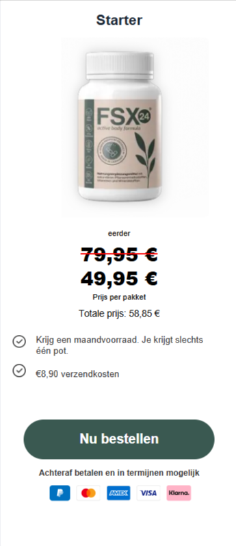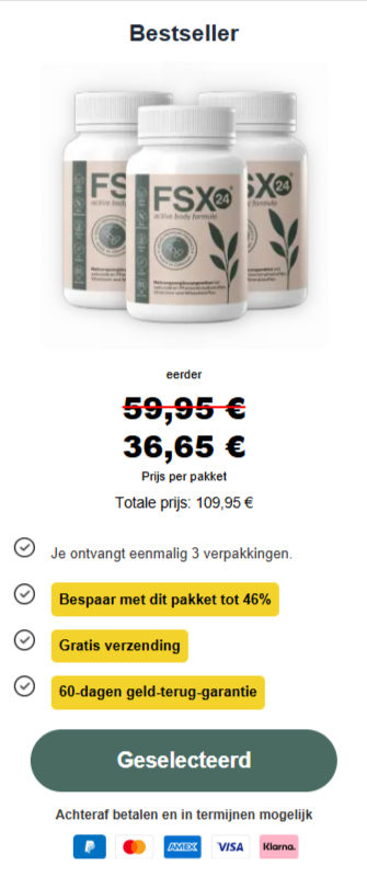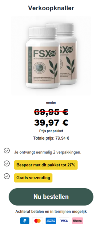 Om de kwaliteit, veiligheid en effectiviteit van uw behandeling te garanderen, is de enige veilige manier om FSX24 te kopen door rechtstreeks via de officiële website te kopen. Zo bent u verzekerd van het originele product, met garantie, ondersteuning en alle kwaliteitsbeloftes van de fabrikant.